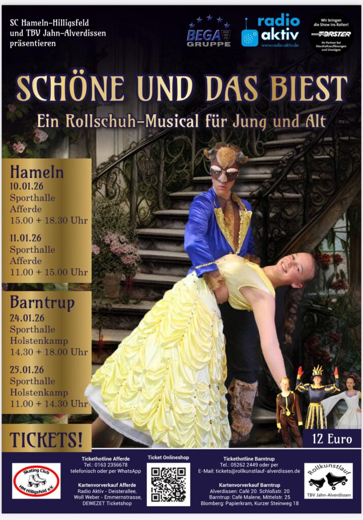 An 2 Tagen, zu jeweils 2 Uhrzeiten, habt ihr die Möglichkeit euch von großen und kleinen Rollkunstläufern verzaubern und in die Welt von Belle und Biest entführen zu lassen.